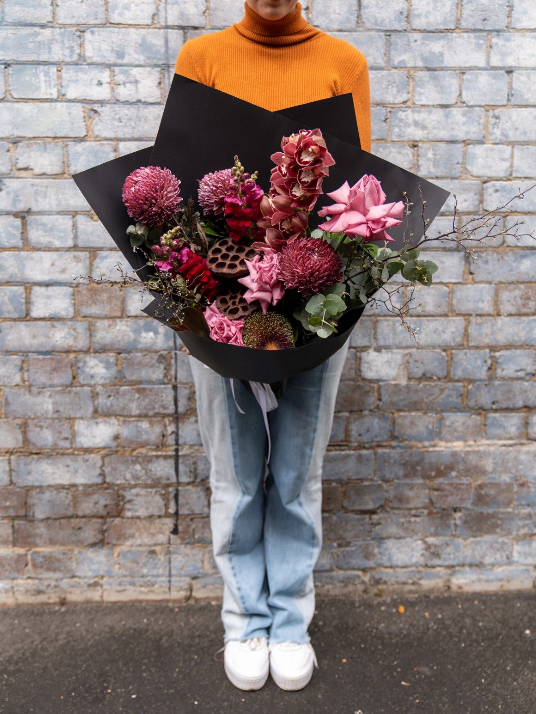 Berry pink chrysanthemums, dusty pink roses and blooming boat orchids make up this extravagant floral arrangement. Berry Crush also features dried lotus heads and banksia that create a truly unique display of texture and colour, bringing a serene allure to any occasion. If a majestic show of affection is your goal, this is the bouquet for you! Flowers – chrysanthemums, Colombian roses, Banksia, snapdragons, dried lotus pods, cymbidium orchids, eucalyptus, and twigs