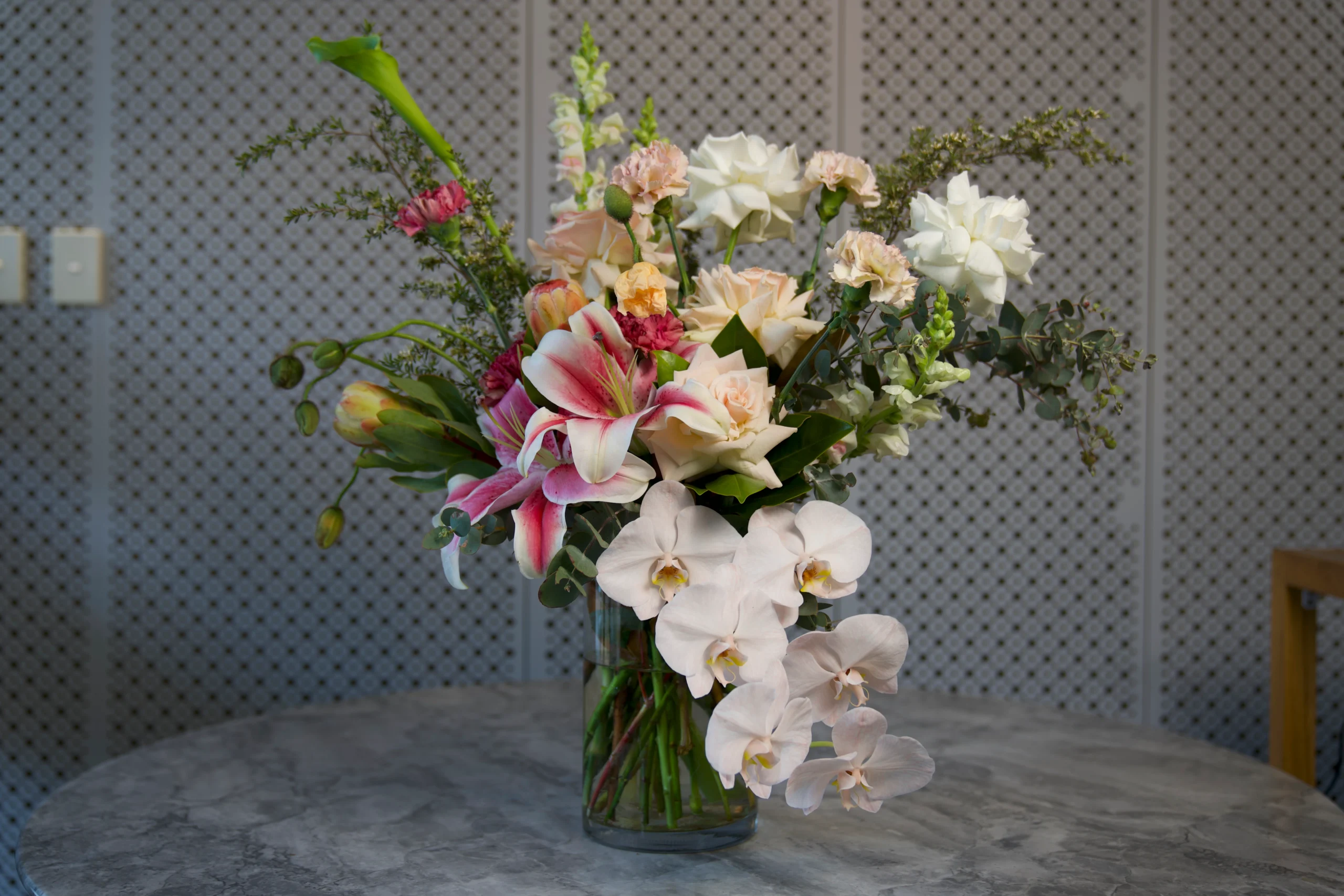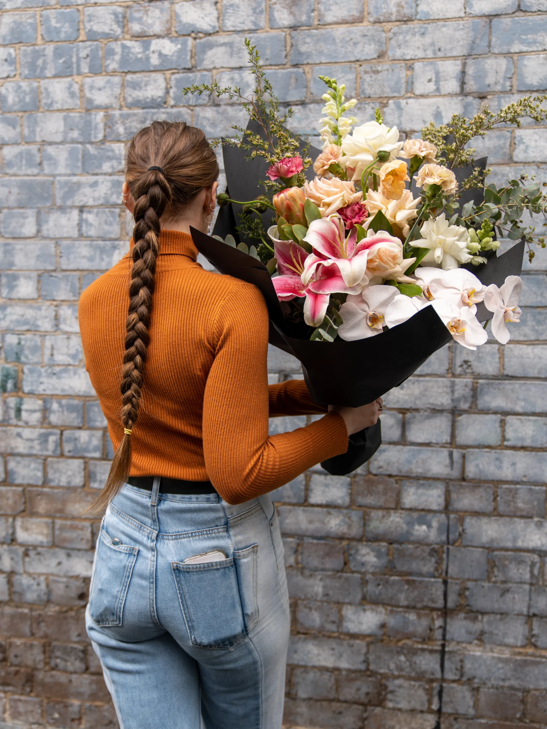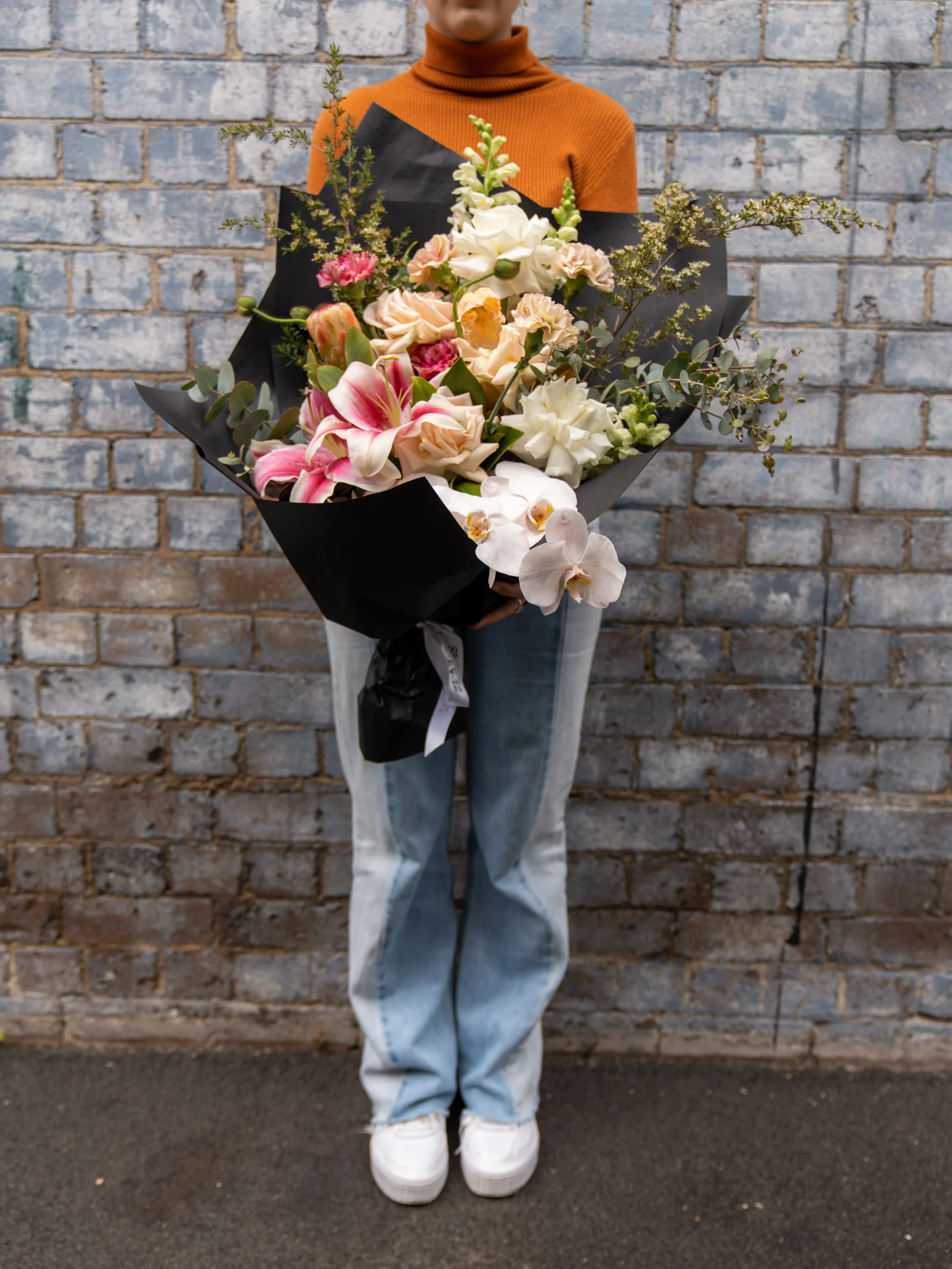 Starring orchids, lilies, reflexed roses, protea and more, the Ethereal Ensemble is an immediate eye-catcher, blossoming with an aura of luxury. The combination of colours and textures makes for a perfect floral composition in a true celebration of nature’s elegance. This show-stopping bouquet is a divine gift for the ones you treasure the most, and is perfect for any celebration, romantic gesture, anniversary, and more! > smaller option will not include orchids Flowers – Oriental lilies, Colombian roses, Phalaenopsis orchids, carnations, poppies, proteas, eucalyptus, tea tree, and snapdragons