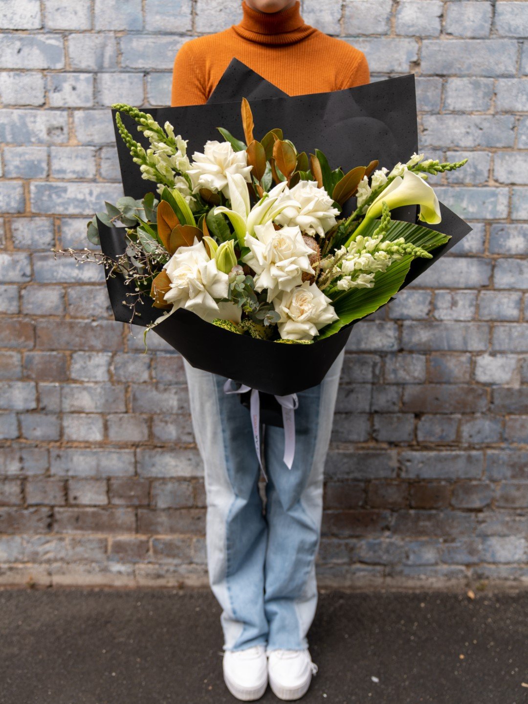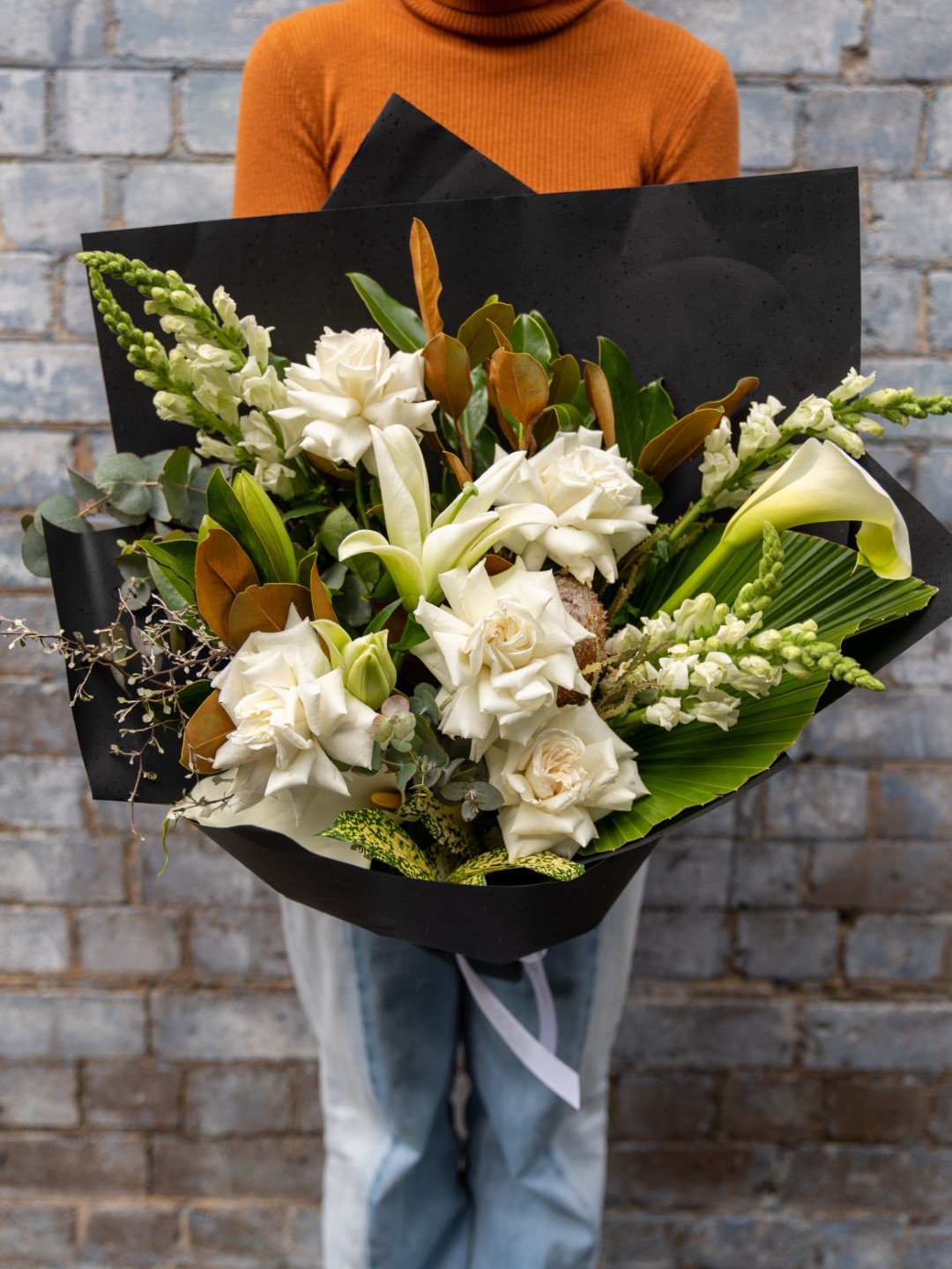 There can never be too many white roses, and Rhonda’s Regards is the perfect classical bouquet to showcase this! Filled with white roses, snapdragons and lilies, and enveloped in lush magnolia leaves, this arrangement exudes luxury and class. With elegant simplicity, Rhonda’s Regards will make a lasting impression on your cherished giftee. Flowers – Colombian roses, Oriental lilies, calla lilies, snapdragons, fresh palm leaves, magnolia, and eucalyptus